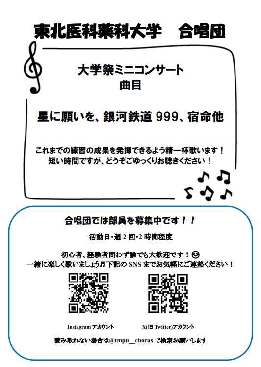 令和5年 東北医科薬科大学 大学祭「Enjoyme!」は10月8日~10月9日の2日間に開催されました。ご来場いただいた皆様、ご協賛された企業の皆様方におかれましては大変感謝申し上げます。